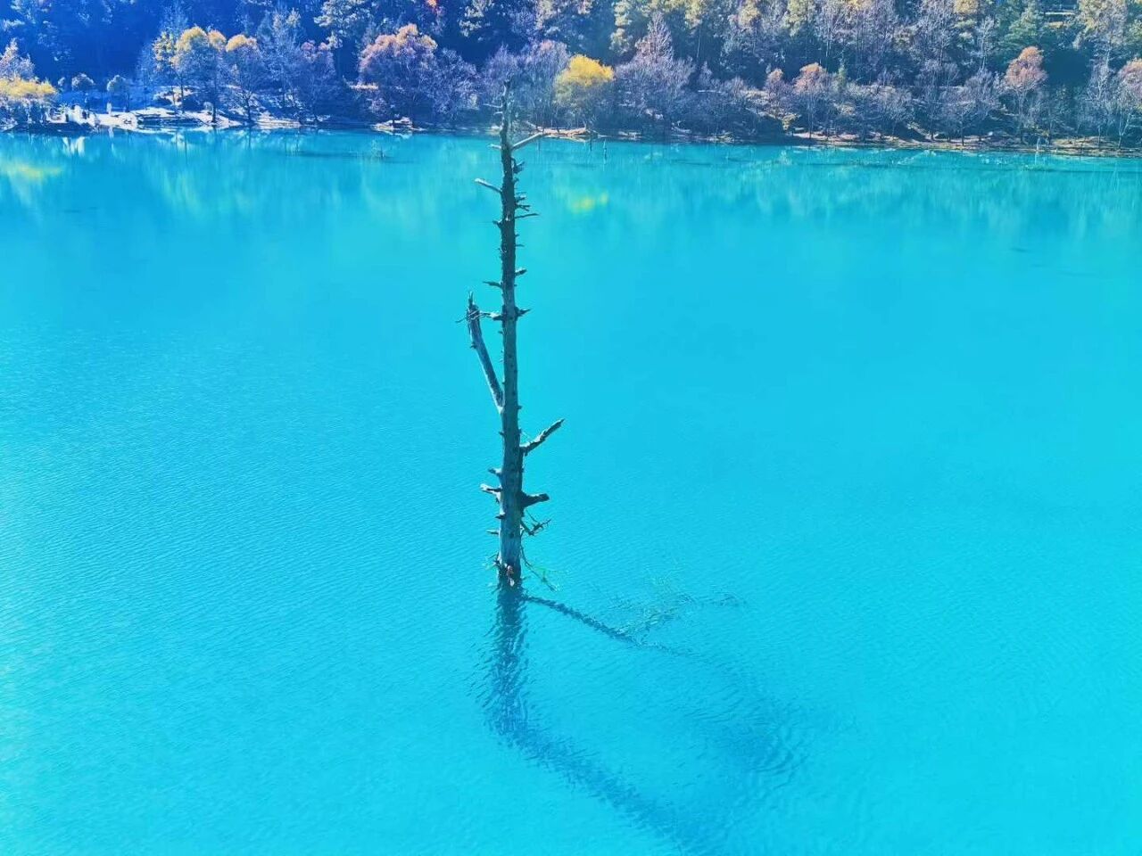 沿著湖邊的木棧道漫步,湖水有時是透亮的淺藍(lán),清得能看見水底游弋的小魚;有時又暈成溫潤的翡翠綠,濃得化不開;轉(zhuǎn)過一道彎,又可能泛起奶白色的漣漪,與岸邊的彩林相映成趣。連立在水里的枯樹都成了獨(dú)特的景致——深褐的枝干浸在藍(lán)得深邃的湖水里,枝丫舒展,像一幅剛完成的水彩畫,意境悠遠(yuǎn)。棧道上的游客都忍不住慢下腳步,舉著手機(jī)不斷拍攝,連呼吸都怕驚擾這湖水的靜謐。